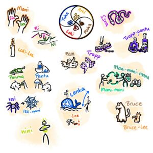 Um, zum Beispiel, groß(es) und klein(es) zu sagen, werden die Worte für Groß und Klein an den eigentlichen Begriff angehängt. Wenn etwas hergestellt oder gemacht wird von, ist es dessen Mani,was auch angeghängt wird. Wie auch das Mana, für die beauftragte oder berufene Person oder Sache.